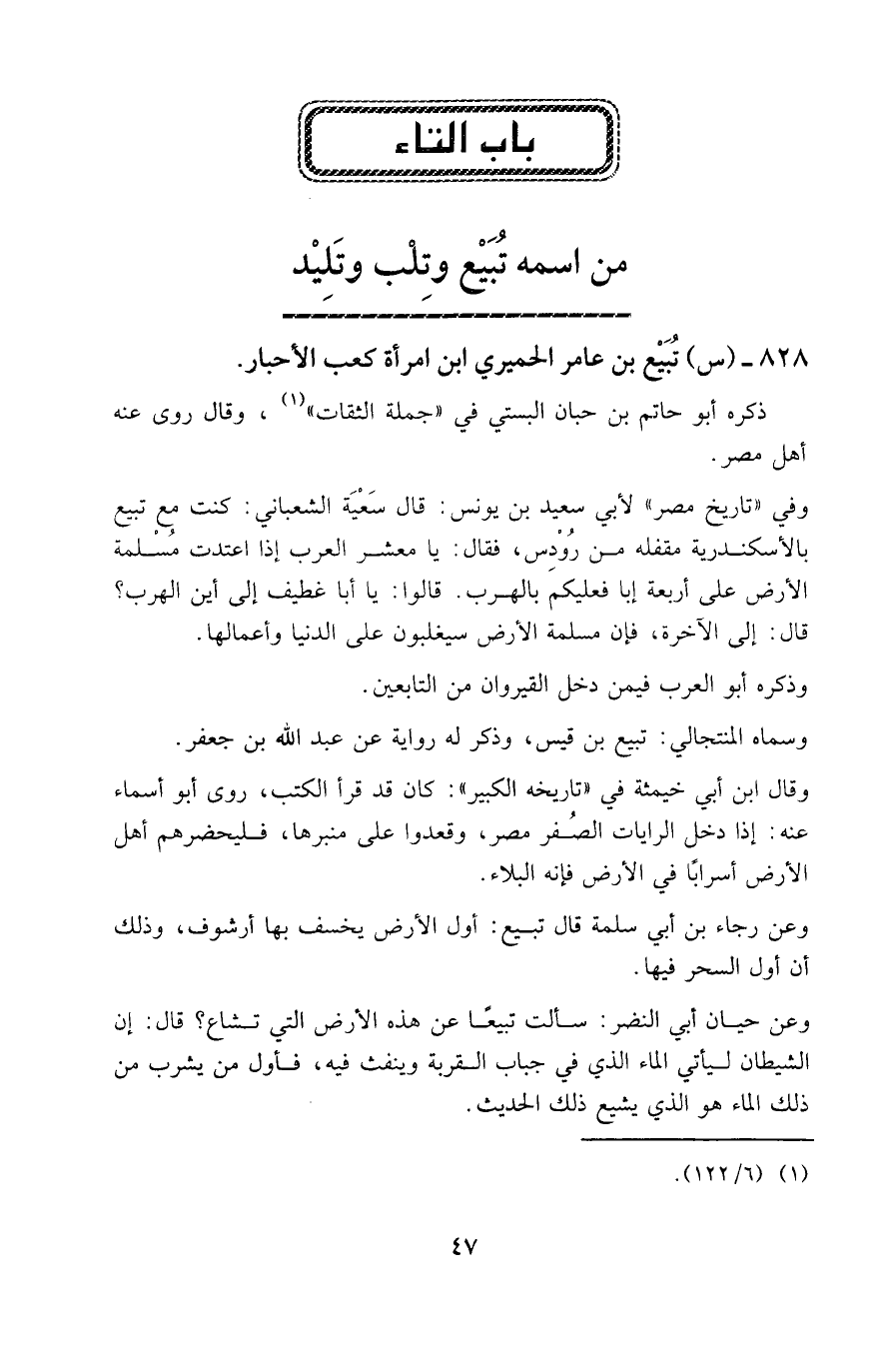828 - (س) تبيع بن عامر الحميري ابن امرأة كعب الأحبار.