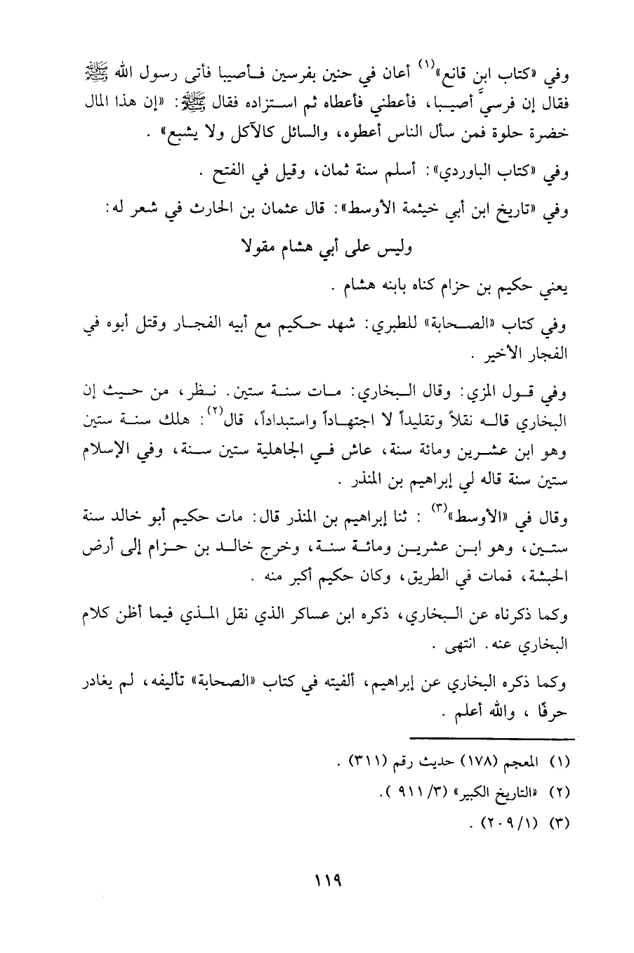 وقال في «الأوسط»: ثنا إبراهيم بن المنذر قال: مات حكيم أبو خالد سنة ستين، وهو ابن عشرين ومائة سنة، وخرج خالد بن حزام إلى أرض الحبشة، فمات في الطريق، وكان حكيم أكبر منه.