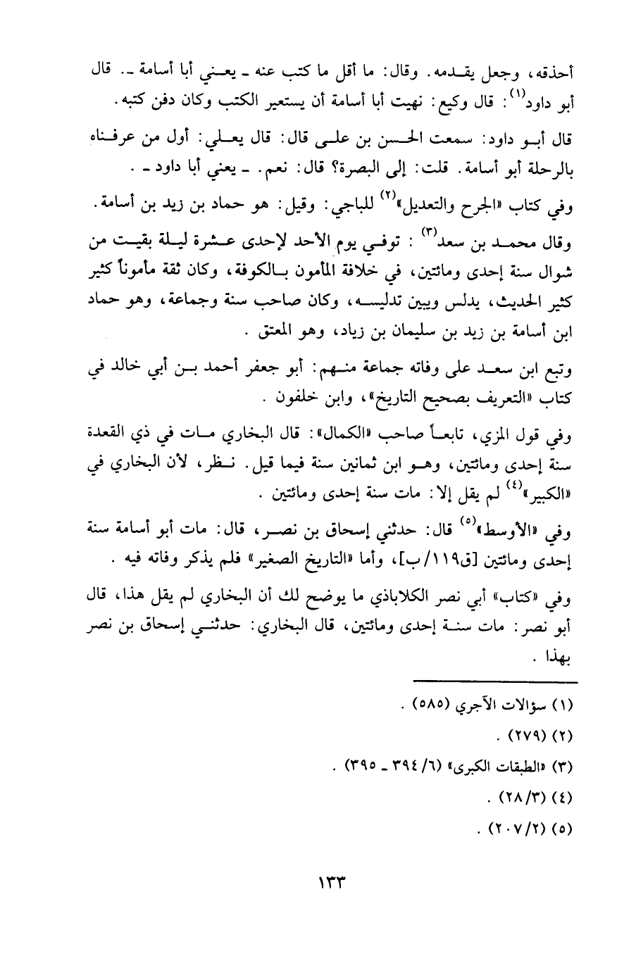 وفي «الأوسط» قال: حدثني إسحاق بن نصر، قال: مات أبو أسامة سنة إحدى ومائتين، وأما «التاريخ الصغير» فلم يذكر وفاته فيه.