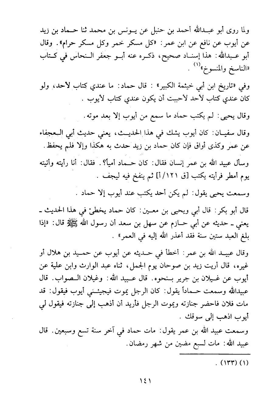 ولما روى أبو عبد الله أحمد بن حنبل عن يونس بن محمد ثنا حماد بن زيد عن أيوب عن نافع عن ابن عمر: «كل مسكر خمر وكل مسكر حرام». وقال أبو عبد الله: هذا إسناد صحيح، ذكره عنه أبو جعفر النحاس في كتاب «الناسخ والمنسوخ».