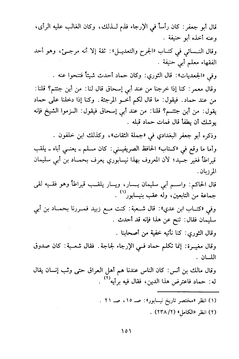 وقال مالك بن أنس: كان الناس عندنا هم أهل العراق حتى وثب إنسان يقال له: حماد فاعترض هذا الدين، فقال فيه برأيه.