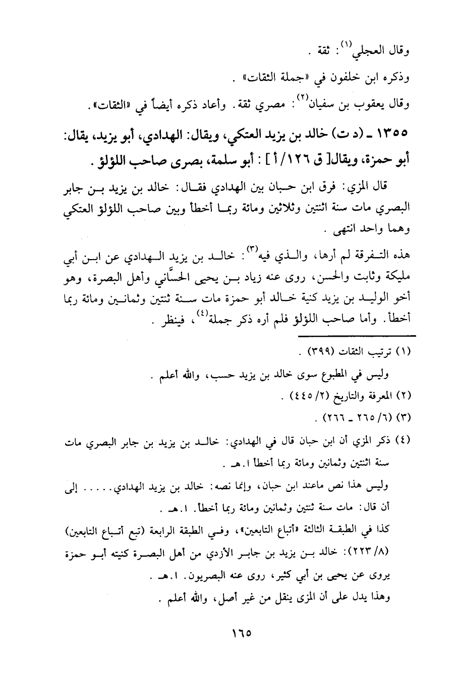 قال المزي: فرق ابن حبان بين الهدادي فقال: خالد بن يزيد بن جابر البصري مات سنة اثنتين وثلاثين ومائة ربما أخطأ، وبين صاحب اللؤلؤ العتكي وهما واحد انتهى.