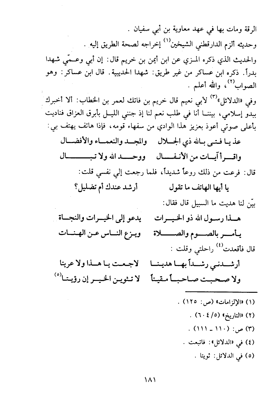 وفي «الدلائل» لأبي نعيم قال خريم بن فاتك لعمر بن الخطاب: ألا أخبرك ببدو إسلامي، بيننا أنا في طلب نعم لنا إذ جنني الليل بأبرق العزاق فناديت بأعلى صوتي أعوذ بعزيز هذا الوادي من سفهاء قومه، فإذا هاتف يهتف بي: