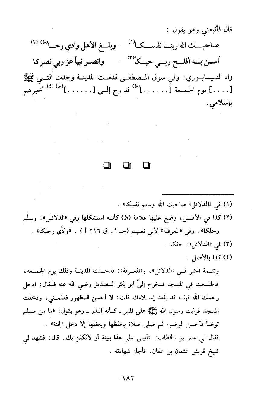 زاد النيسابوري: وفي سوق المصطفى قدمت المدينة وجدت النبي صلى الله عليه وسلم (. .) يوم الجمعة (. .) قد رح إلى (. . .) أخبرهم بإسلامي.