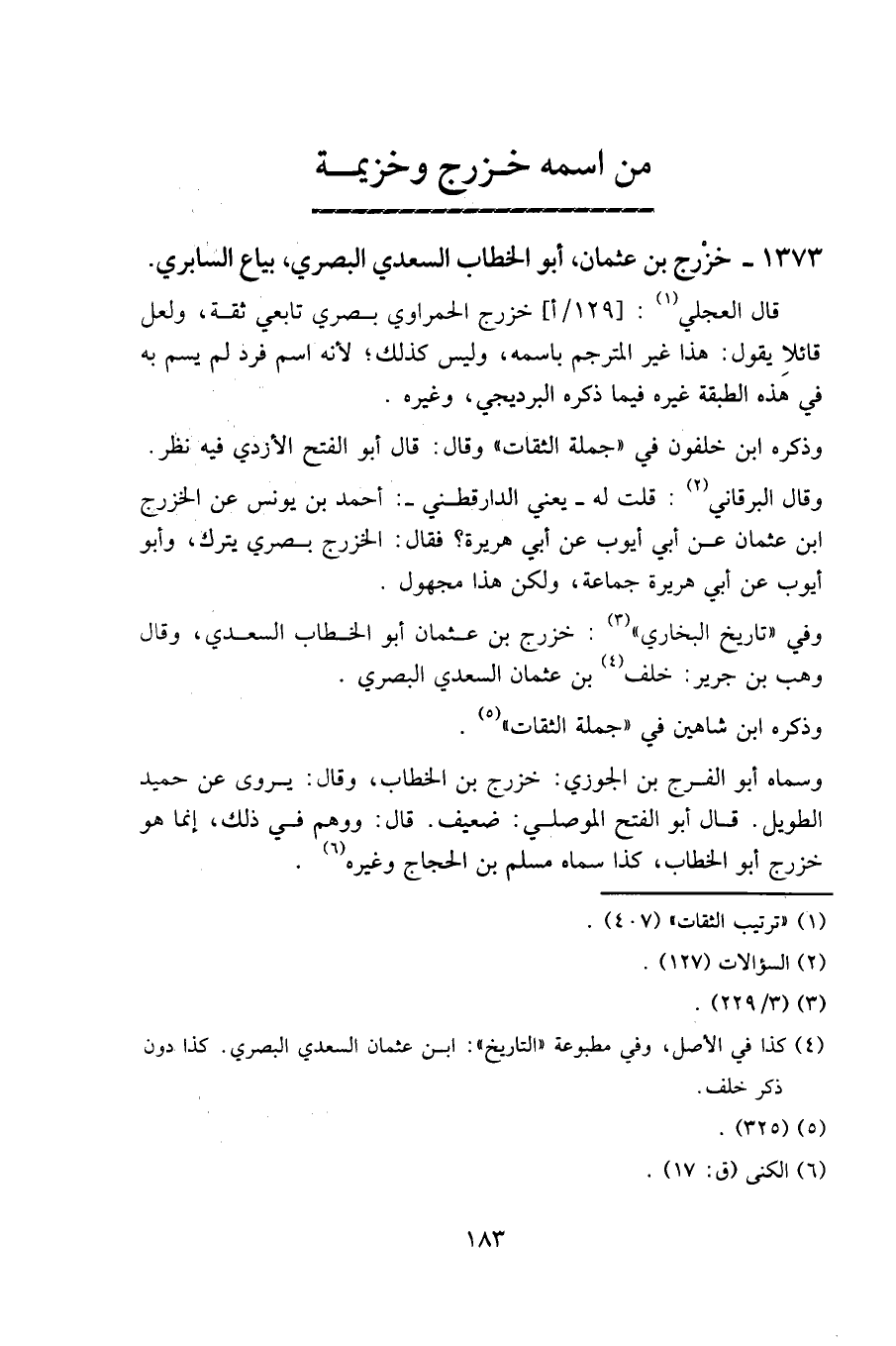 وفي «تاريخ البخاري»: خزرج بن عثمان أبو الخطاب السعدي، وقال وهب بن جرير: خلف بن عثمان السعدي البصري.