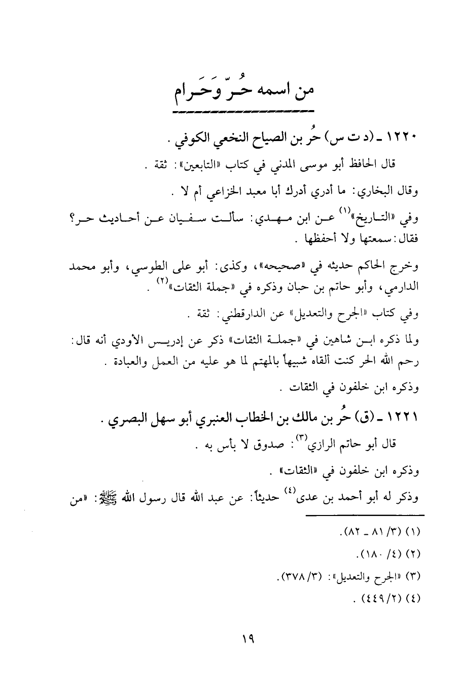 ولما ذكره ابن شاهين في «جملة الثقات» ذكر عن إدريس الأودي أنه قال: رحم الله الحر كنت ألقاه شبيها بالمهتم لما هو عليه من العمل والعبادة.