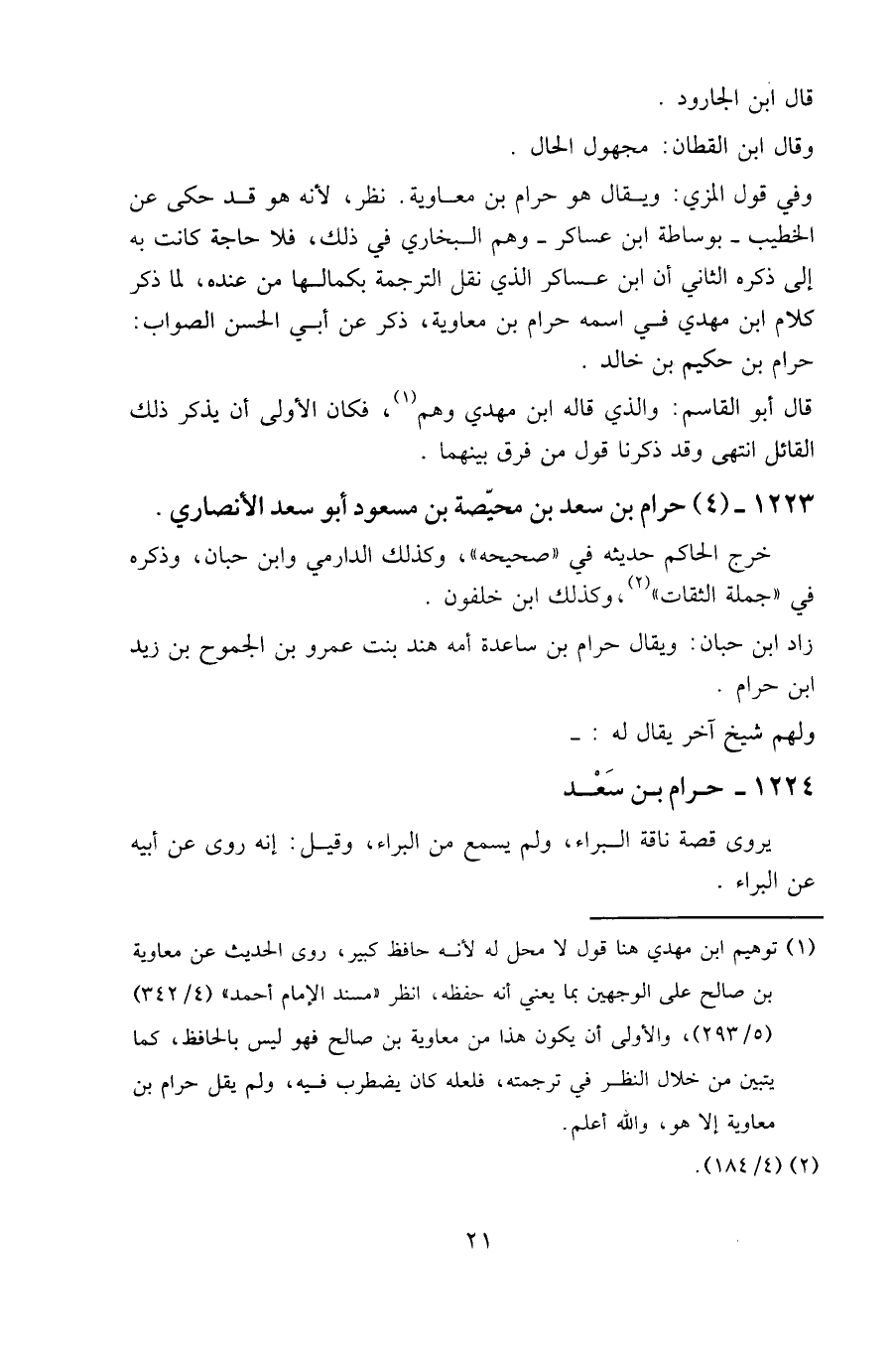 وفي قول المزي: ويقال هو حرام بن معاوية. نظر؛ لأنه هو قد حكى عن الخطيب – بوساطة ابن عساكر - وهم البخاري في ذلك، فلا حاجة كانت به إلى ذكره الثاني أن ابن عساكر الذي نقل الترجمة بكمالها من عنده، لما ذكر كلام ابن مهدي في اسمه حرام بن معاوية، ذكر عن أبي الحسن الصواب: حرام بن حكيم بن خالد.