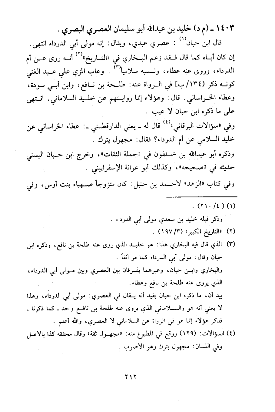 وفي «سؤالات البرقاني» قال له – يعني الدارقطني -: عطاء الخراساني عن خليد السلامي عن أم الدرداء؟ فقال: مجهول يترك.
