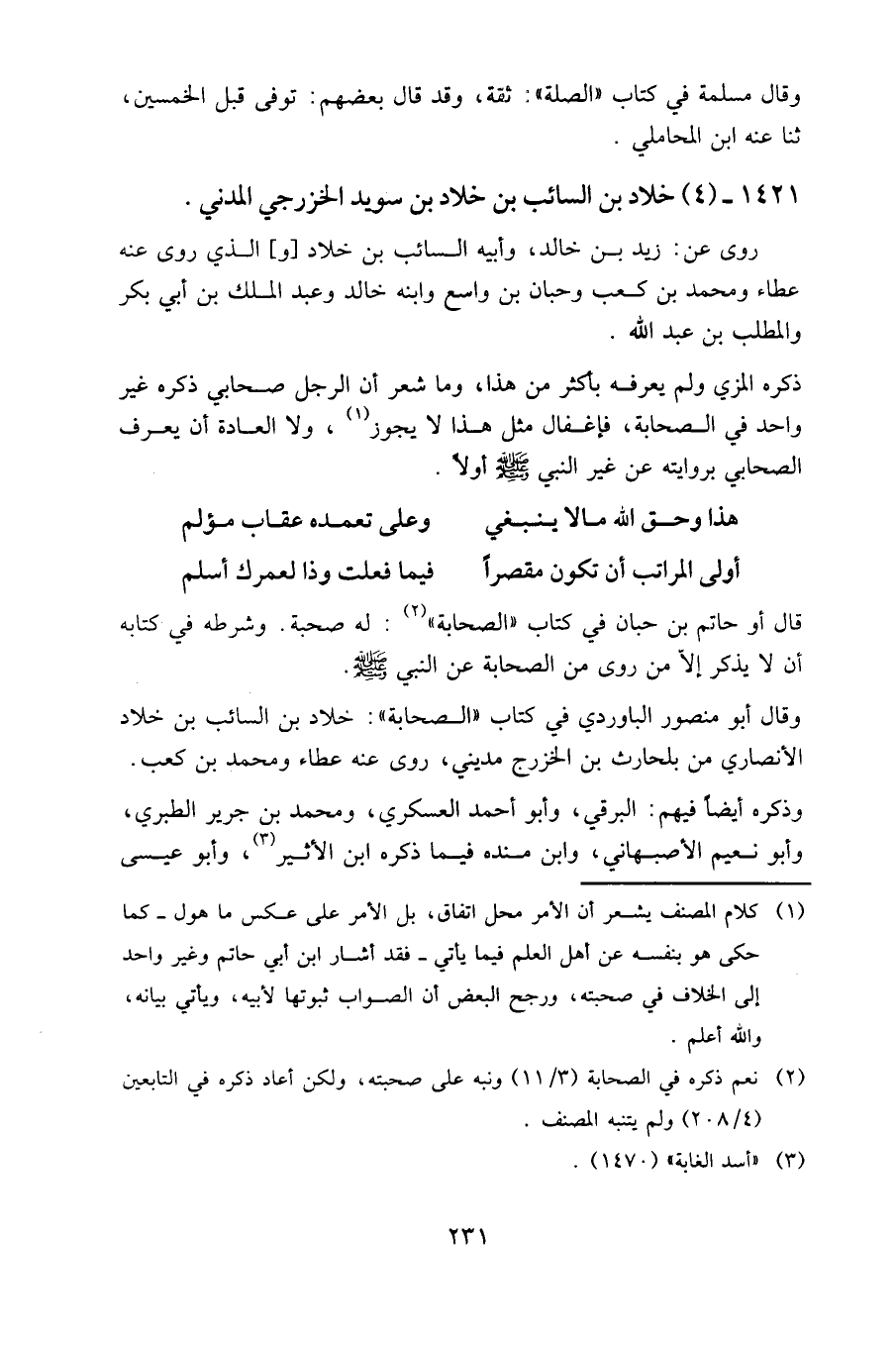1421 - (4) خلاد بن السائب بن خلاد بن سويد الخزرجي المدني.