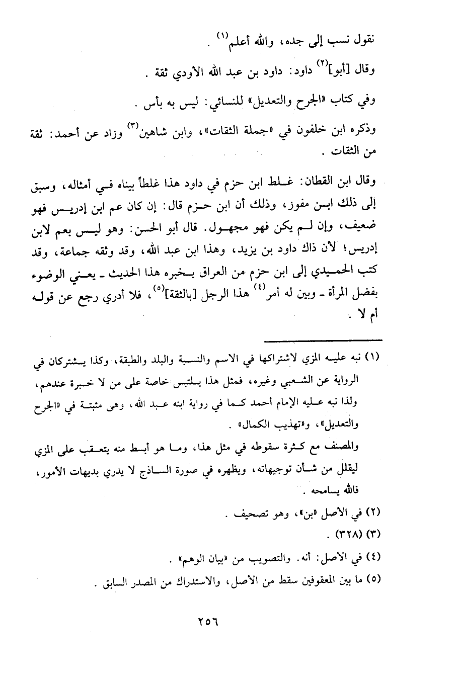 وقال ابن القطان: غلط ابن حزم في داود هذا غلطا بيناه في أمثاله، وسبق إلى ذلك ابن مفوز، وذلك أن ابن حزم قال: إن كان عم ابن إدريس فهو ضعيف، وإن لم يكن فهو مجهول. قال أبو الحسن: وهو ليس بعم لابن إدريس؛ لأن ذاك داود بن يزيد، وهذا ابن عبد الله، وقد وثقه جماعة، وقد كتب الحميدي إلى ابن حزم من العراق يخبره هذا الحديث – يعني الوضوء بفضل المرأة - وبين له أمر هذا الرجل (بالثقة)، فلا أدري رجع عن قوله أم لا.