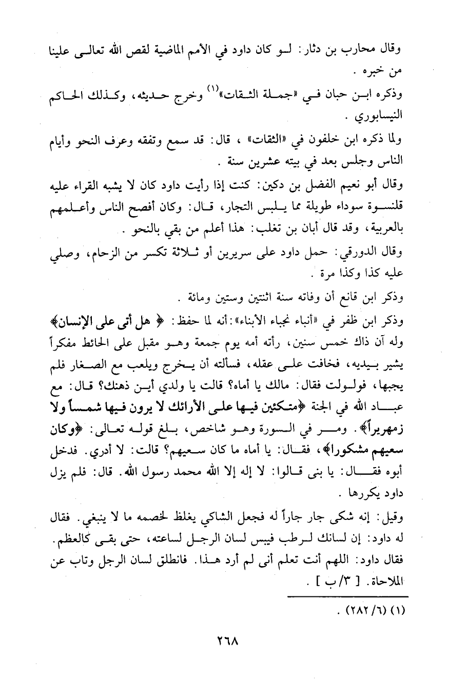 وذكر ابن ظفر في «أنباء نجباء الأبناء»: أنه لما حفظ: (هل أتى على الإنسان) وله آن ذاك خمس سنين، رأته أمه يوم جمعة وهو مقبل على الحائط مفكرا يشير بيديه، فخافت على عقله، فسألته أن يخرج ويلعب مع الصغار فلم يجبها، فولولت فقال: ما لك يا أماه؟ قالت: يا ولدى أين ذهنك؟ قال: مع عباد الله في الجنة (متكئين فيها على الأرائك لا يرون فيها شمسا ولا زمهريرا). ومر في السورة وهو شاخص، بلغ قوله تعالى: (وكان سعيهم مشكورا)، فقال: يا أماه ما كان سعيهم؟ قالت: لا أدري. فدخل أبوه فقال: يا بنى قالوا: لا إله إلا الله محمد رسول الله. قال: فلم يزل داود يكررها.