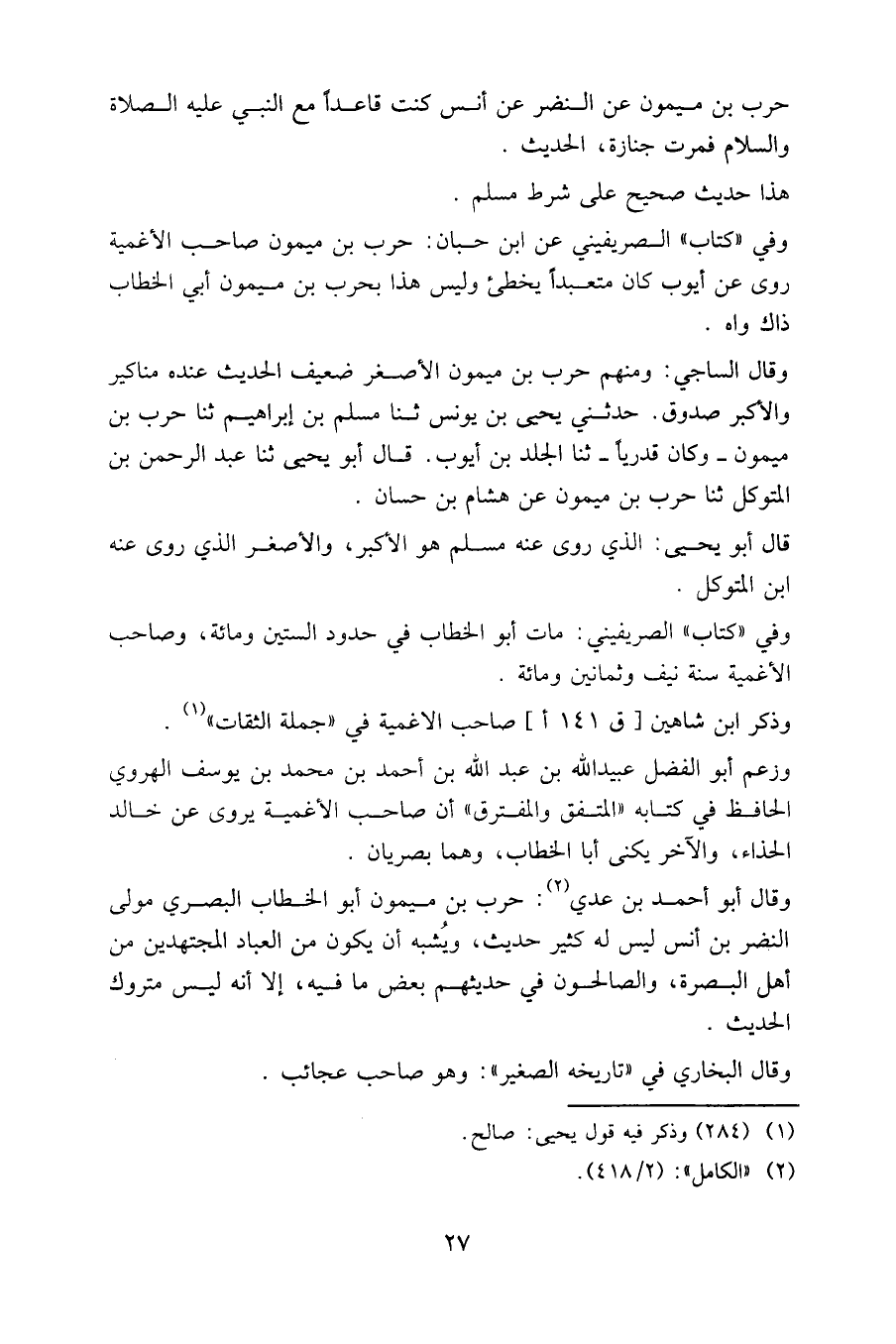 وقال الساجي: ومنهم حرب بن ميمون الأصغر ضعيف الحديث عنده مناكير والأكبر صدوق. حدثني يحيى بن يونس، ثنا مسلم بن إبراهيم، ثنا حرب بن ميمون – وكان قدريا - ثنا الجلد بن أيوب. قال أبو يحيى: ثنا عبد الرحمن بن المتوكل، ثنا حرب بن ميمون، عن هشام بن حسان.