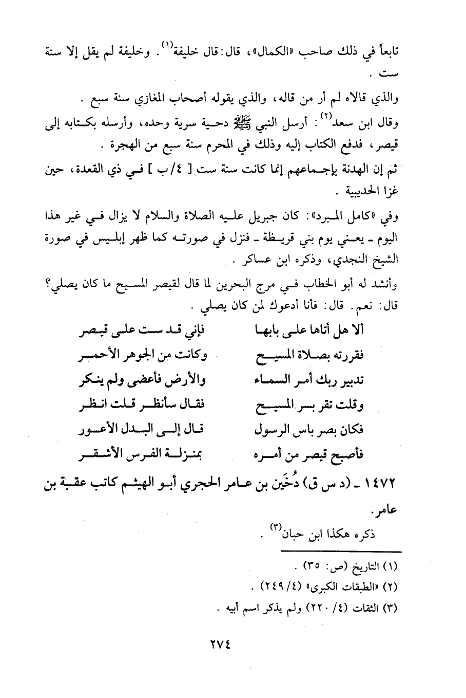 وقال ابن سعد: أرسل النبي صلى الله عليه وسلم دحية سرية وحده، وأرسله بكتابه إلى قيصر، فدفع الكتاب إليه، وذلك في المحرم سنة سبع من الهجرة.