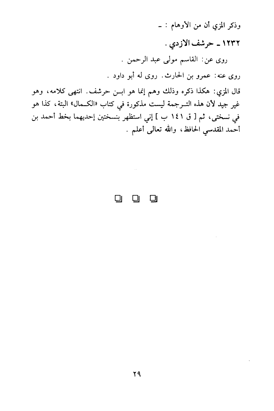 قال المزي: هكذا ذكره وذلك وهم، إنما هو ابن حرشف. انتهى كلامه، وهو غير جيد؛ لأن هذه الترجمة ليست مذكورة في كتاب «الكمال» البتة، كذا هو في نسختي، ثم إني أستظهر بنسختين إحديهما بخط أحمد بن أحمد المقدسي الحافظ، والله تعالى أعلم.
