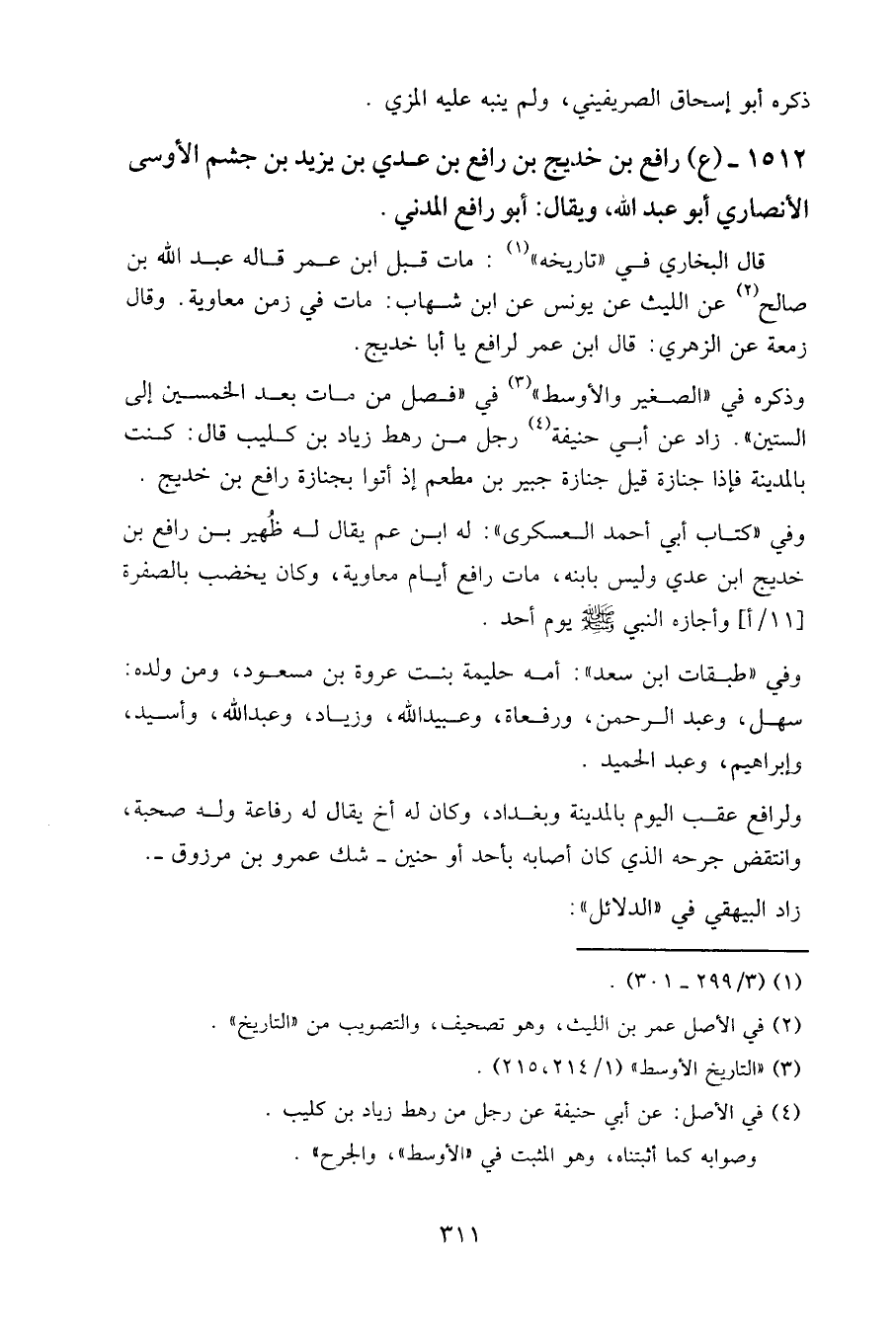 1512 - (ع) رافع بن خديج بن رافع بن عدي بن يزيد بن جشم الأوسي الأنصاري، أبو عبد الله، ويقال: أبو رافع المدني.