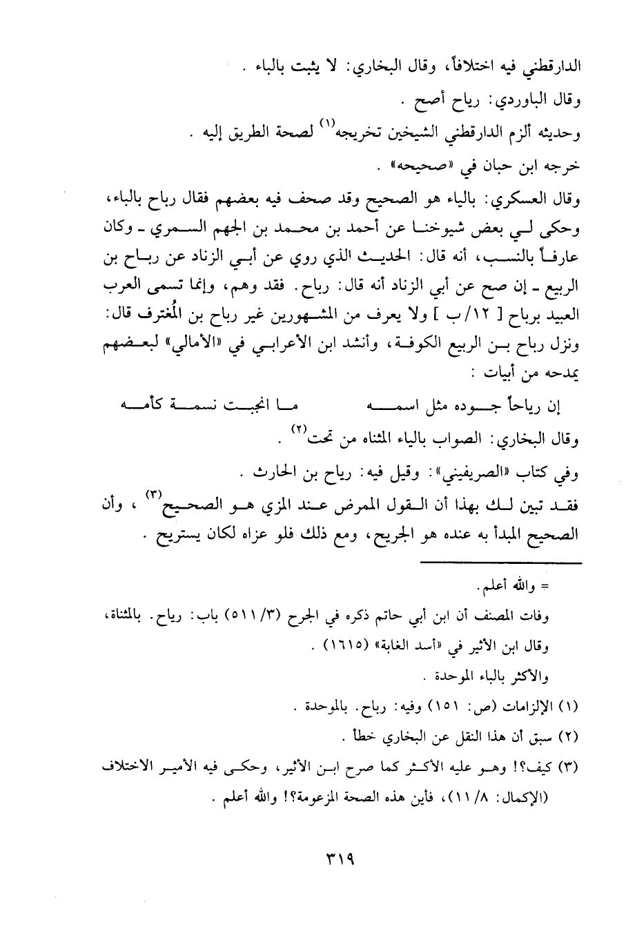 وقال العسكري: بالياء هو الصحيح، وقد صحف فيه بعضهم فقال: رباح بالباء، وحكى لي بعض شيوخنا عن أحمد بن محمد بن الجهم السمري وكان عارفا بالنسب، أنه قال: الحديث الذي روي عن أبي الزناد عن رباح بن الربيع إن صح عن أبي الزناد أنه قال: رباح. فقد وهم، وإنما تسمي العرب العبيد برباح ولا يعرف من المشهورين غير رباح بن المغترف قال: ونزل رباح بن الربيع