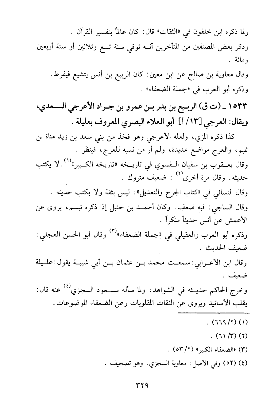 1533 - (ت ق) الربيع بن بدر بن عمرو بن جراد الأعرجي السعدي، ويقال: العرجي أبو العلاء البصري المعروف بعليلة.