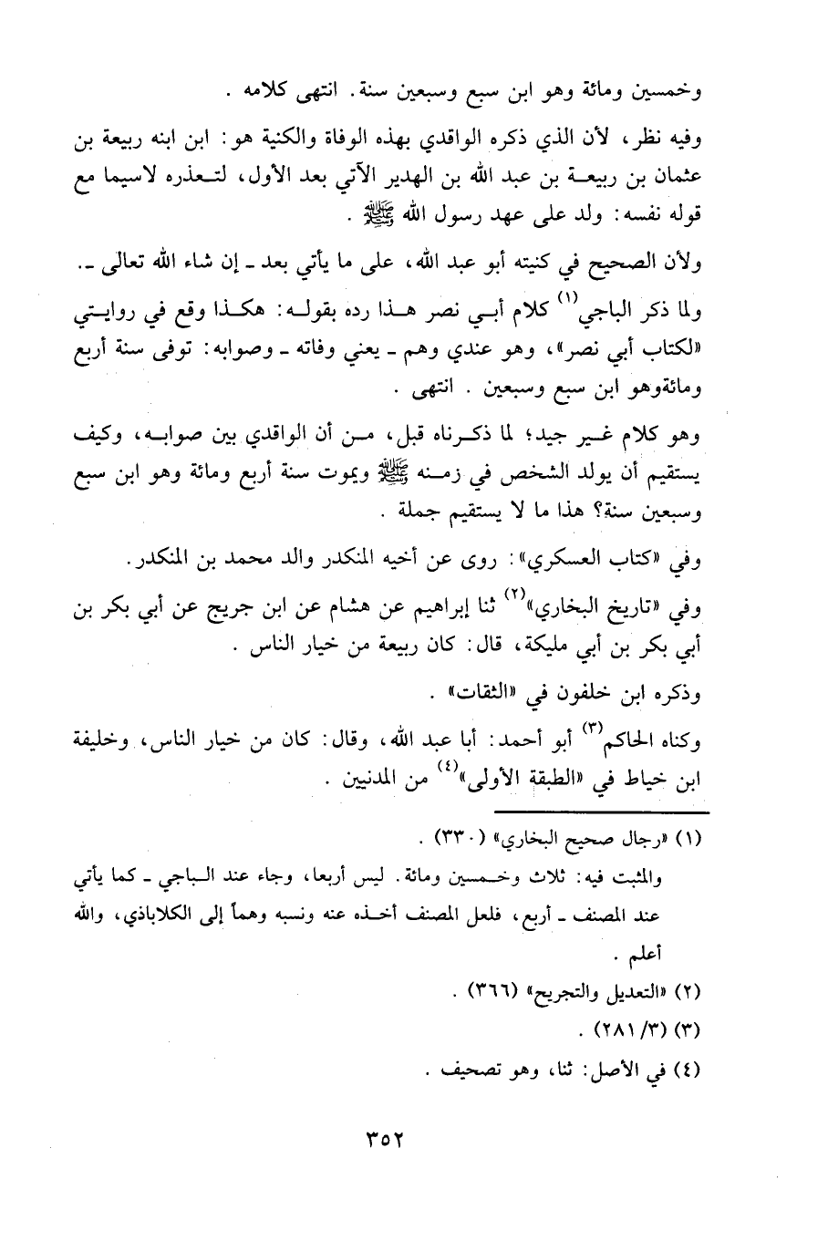 وفيه نظر؛ لأن الذي ذكره الواقدي بهذه الوفاة والكنية هو: ابن ابنه ربيعة بن عثمان بن ربيعة بن عبد الله بن الهدير الآتي بعد الأول، لتعذره، لا سيما مع قوله نفسه: ولد على عهد رسول الله صلى الله عليه وسلم.
