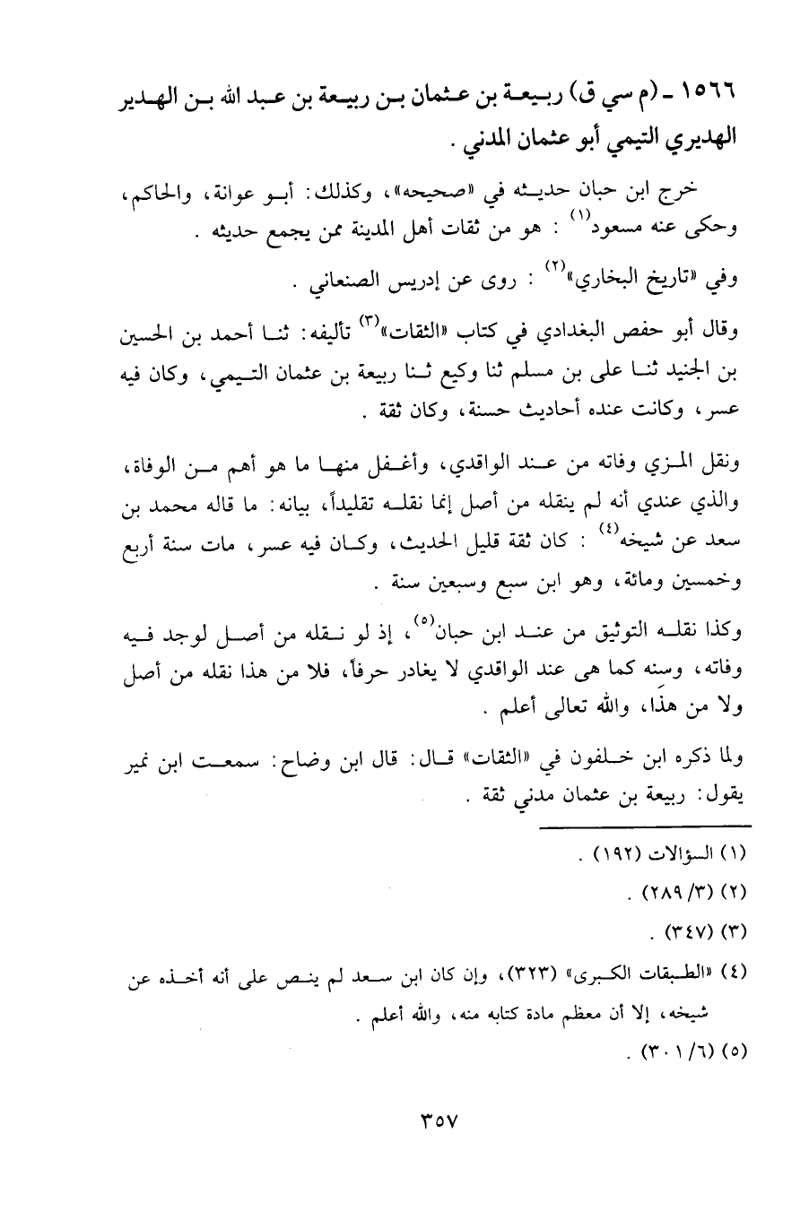 ولما ذكره ابن خلفون في «الثقات» قال: قال ابن وضاح: سمعت ابن نمير يقول: ربيعة بن عثمان مدني ثقة.