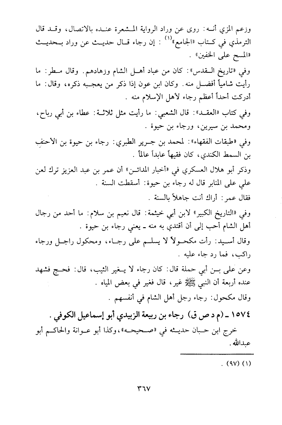 وزعم المزي أنه: روى عن وراد الرواية المشعرة عنده بالاتصال، وقد قال الترمذي في كتاب «الجامع»: إن رجاء قال حديث عن وراد بحديث «المسح على الخفين».