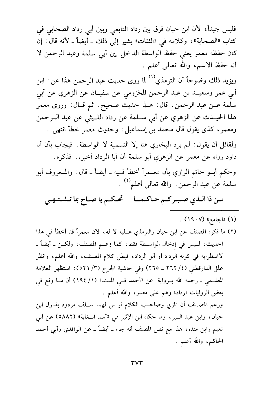 فليس جيدا، لأن ابن حبان فرق بين رداد التابعي وبين أبي رداد الصحابي في كتاب «الصحابة»، وكلامه في «الثقات» يشير إلى ذلك - أيضا - لأنه قال: إن كان حفظه معمر يعني حفظ الواسطة الداخل بين أبي سلمة وعبد الرحمن لا أنه حفظ الاسم، والله تعالى أعلم.
