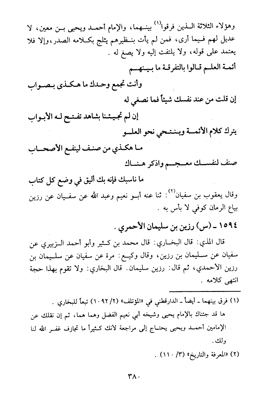 وهؤلاء الثلاثة الذين فرقوا بينهما، والإمام أحمد ويحيى بن معين، لا عديل لهم فيما أرى، فمن لم يأت بنظيرهم يثلج بكلامه الصدر، وإلا فلا يعتمد على قوله، ولا يلتفت إليه ولا يصغ له.