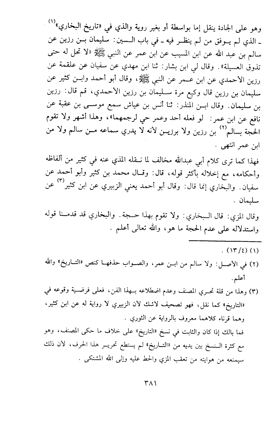 وهو على الجادة ينقل إما بواسطة أو بغير روية، والذي في «تاريخ البخاري» - الذي لم يوفق من لم ينظر فيه - في باب السين: سليمان بن رزين، عن سالم بن عبد الله، عن ابن المسيب، عن ابن عمر، عن النبي صلى الله عليه وسلم: «لا تحل له حتى تذوق العسيلة». وقال لي ابن بشار: ثنا ابن مهدي، عن سفيان، عن علقمة، عن رزين الأحمدي، عن ابن عمر، عن النبي صلى الله عليه وسلم، وقال أبو أحمد وابن كثير عن سليمان بن رزين قال وكيع مرة سليمان بن رزين الأحمدي، قم قال: رزين بن سليمان. وقال ابن المنذر: ثنا أنس بن عياش، سمع موسى بن عقبة، عن نافع، عن ابن عمر: لو فعله أحد وعمر حي لرجمهما»، وهذا أشهر ولا تقوم الحجة بسالم بن رزين، ولا برزين لأنه لا يدري سماعه من سالم، ولا من ابن عمر انتهى.