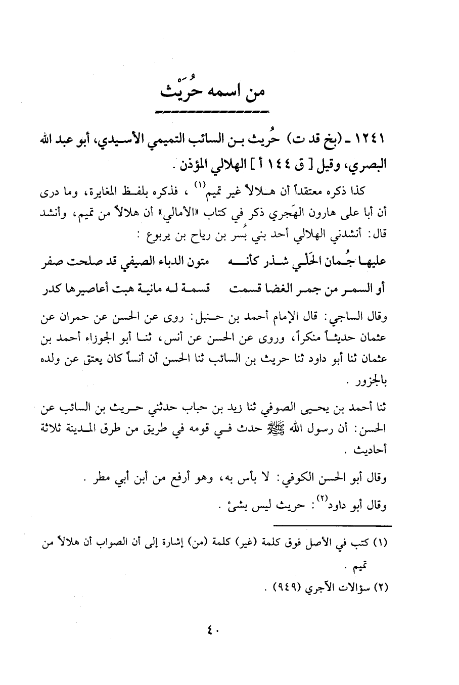 1241 - (بخ قد ت) حريث بن السائب التميمي الأسيدي، أبو عبد الله البصري، وقيل الهلالي المؤذن.