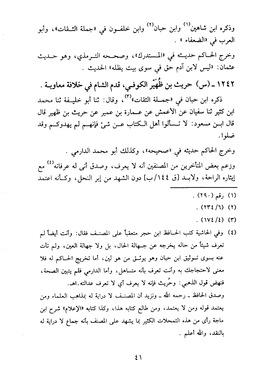 1242 - (س) حريث بن ظهير الكوفي، قدم الشام في خلافة معاوية.