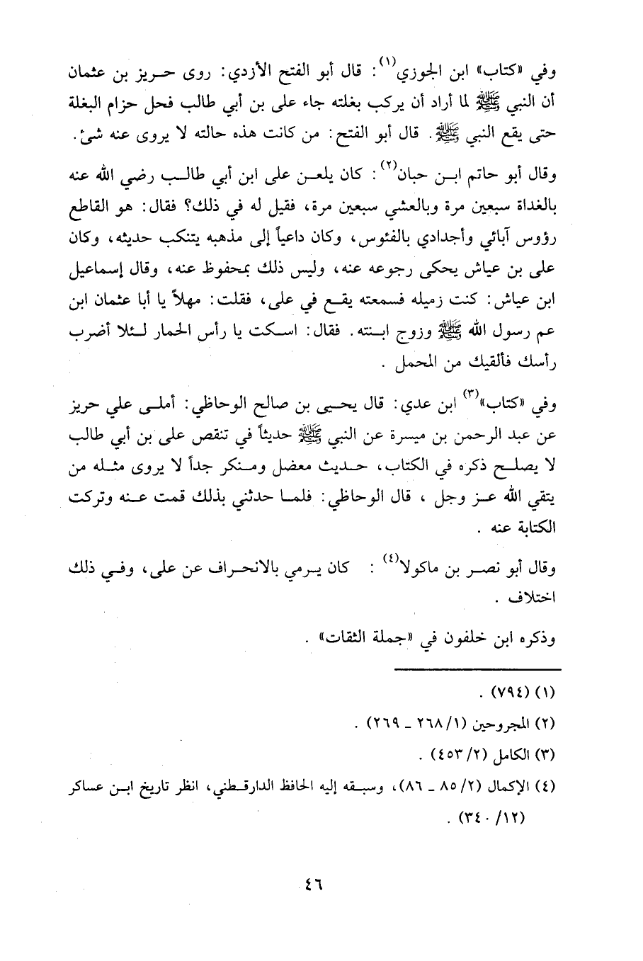 وفي «كتاب» ابن الجوزي: قال أبو الفتح الأزدي: روى حريز بن عثمان أن النبي صلى الله عليه وسلم لما أراد أن يركب بغلته جاء علي بن أبي طالب فحل حزام البغلة حتى يقع النبي صلى الله عليه وسلم. قال أبو الفتح: من كانت هذه حالته لا يروى عنه شيء.