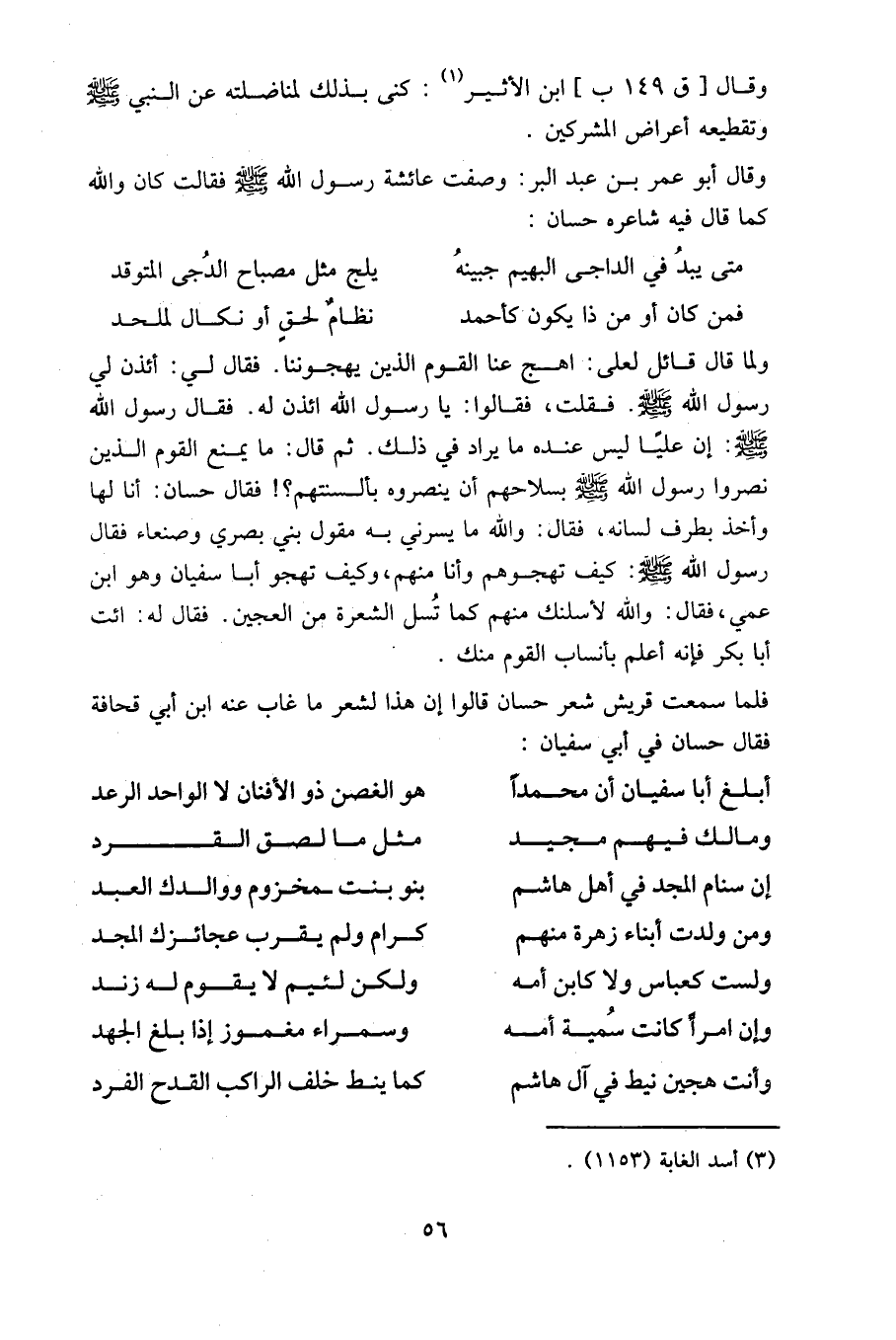 وأنا منهم، وكيف تهجو أبا سفيان وهو ابن عمي، فقال: والله لأسلنك منهم كما تسل الشعرة من العجين. فقال له: ائت أبا بكر فإنه أعلم بأنساب القوم منك.