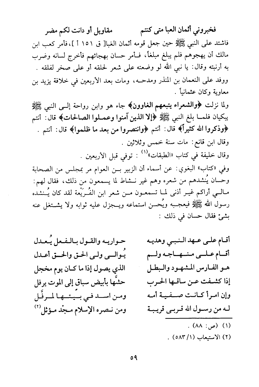وفي «كتاب» البغوي: عن أسماء أن الزبير بن العوام مر بمجلس من الصحابة وحسان ينشدهم من شعره وهم غير نشاط لما يسمعون من ذلك، فقال لهم: ما لي أراكم غير أذنى لما تسمعون من شعر ابن الفريعة، لقد كان ينشده رسول الله صلى الله عليه وسلم فيعجبه ويحسن استماعه ويجزل عليه ثوابه ولا يشتغل عنه بشيء فقال حسان في ذلك: