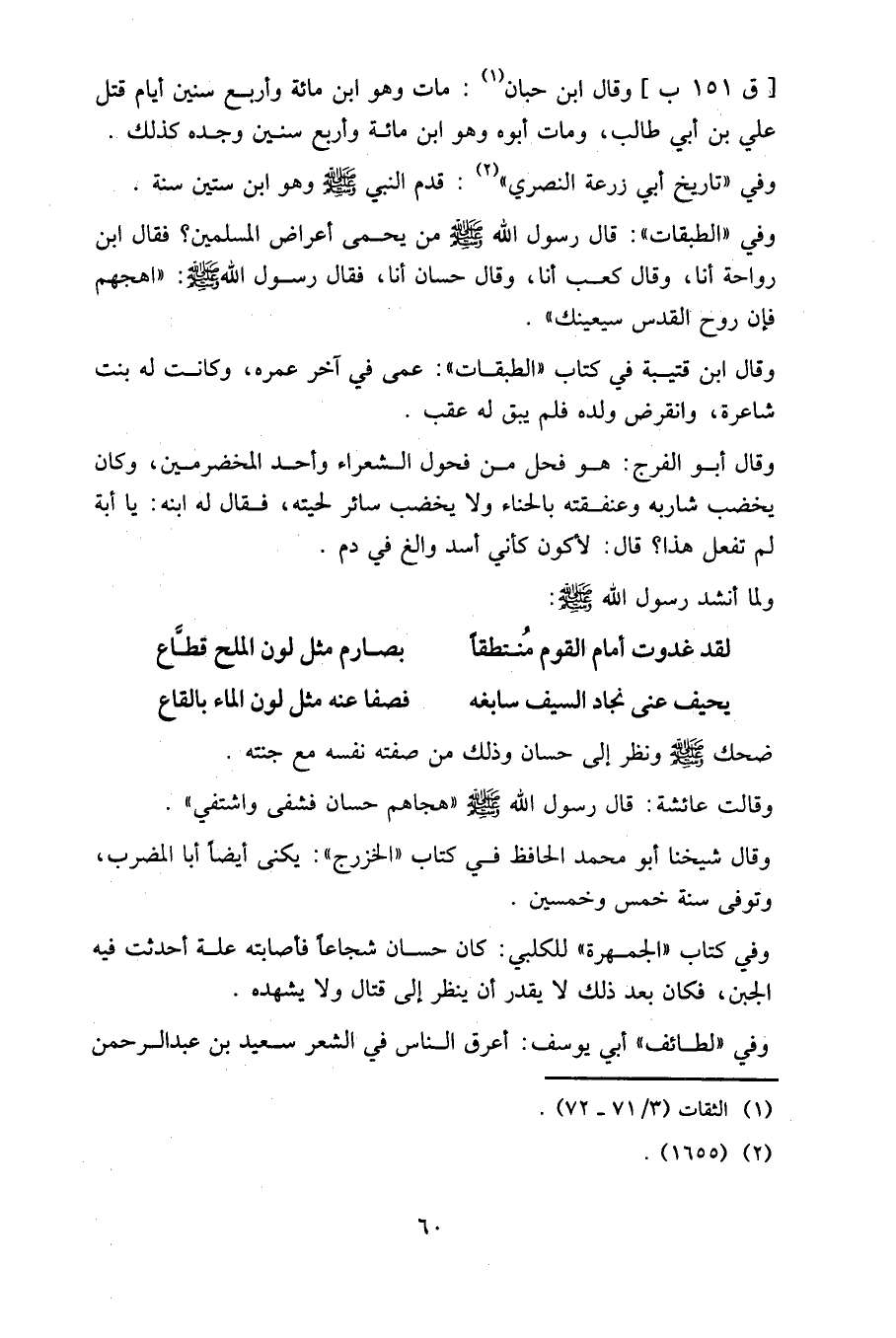 وفي «الطبقات»: قال رسول الله صلى الله عليه وسلم من يحمي أعراض المسلمين؟ فقال ابن رواحة: أنا، وقال كعب: أنا، وقال حسان: أنا، فقال رسول الله صلى الله عليه وسلم: «اهجهم فإن روح القدس سيعينك».
