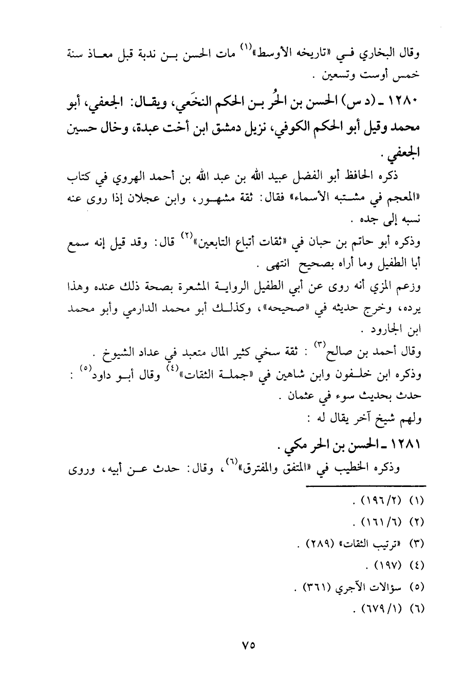 1280 - (د س) الحسن بن الحر بن الحكم النخعي، ويقال: الجعفي، أبو محمد وقيل أبو الحكم الكوفي، نزيل دمشق ابن أخت عبدة، وخال حسين الجعفي.