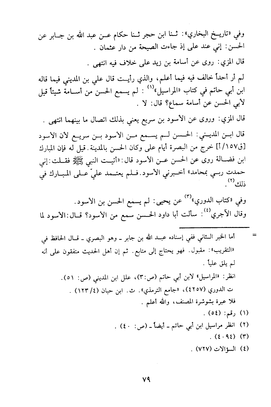 قال ابن المديني: الحسن لم يسمع من الأسود بن سريع؛ لأن الأسود خرج من البصرة أيام علي، وكان الحسن بالمدينة. قيل له فإن المبارك بن فضالة روى عن الحسن عن الأسود قال: «أتيت النبي صلى الله عليه وسلم فقلت: إني حمدت ربي بمحامد» أخبرني الأسود. فلم يعتمد علي على المبارك في ذلك.