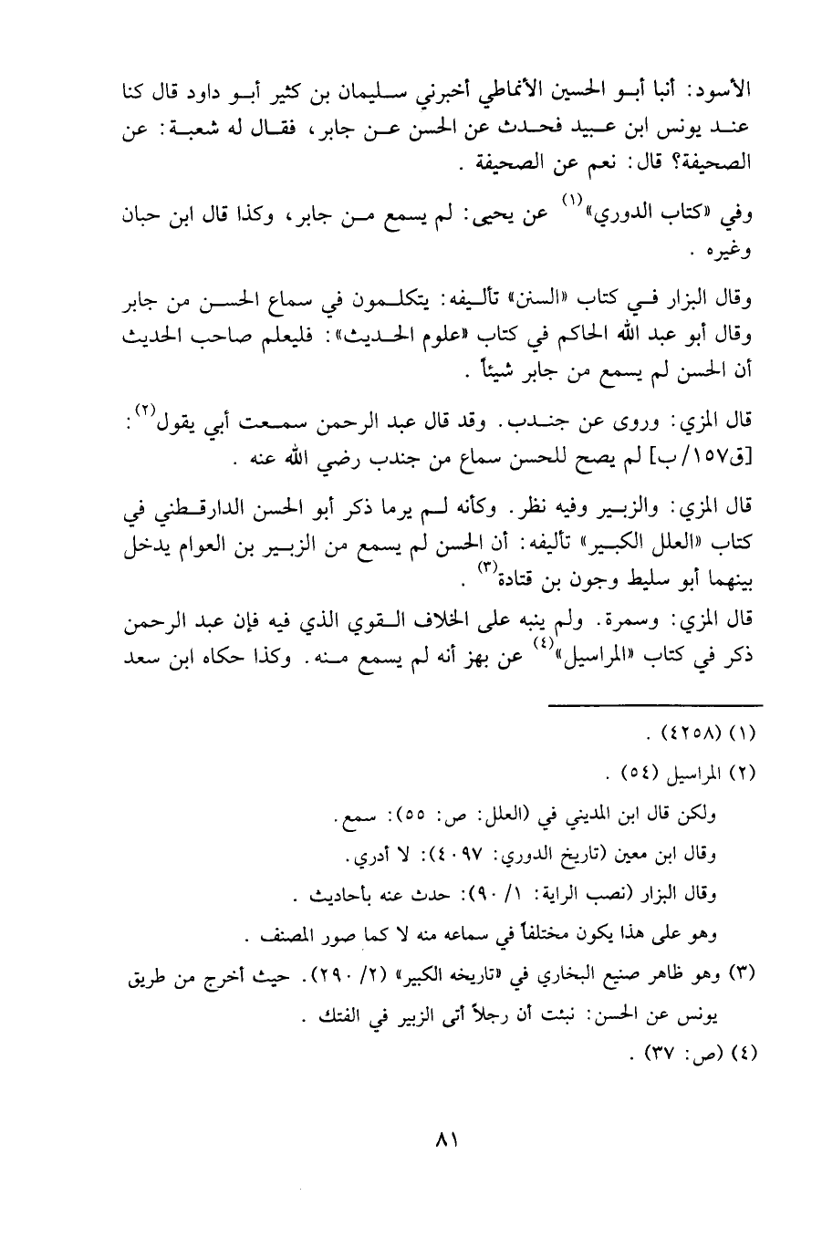 وقال البزار في كتاب «السنن» تأليفه: يتكلمون في سماع الحسن من جابر، وقال أبو عبد الله الحاكم في كتاب «علوم الحديث»: فليعلم صاحب الحديث أن الحسن لم يسمع من جابر شيئا.