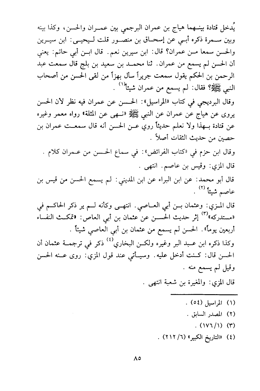 وقال البرديجي في كتاب «المراسيل»: الحسن عن عمران فيه نظر؛ لأن الحسن يروي عن هياج، عن عمران، عن النبي صلى الله عليه وسلم «نهى عن المثلة» رواه معمر وغيره عن قتادة بهذا، ولا نعلم حديثا روي عن الحسن أنه قال: سمعت عمران بن حصين من حديث الثقات أصلا.