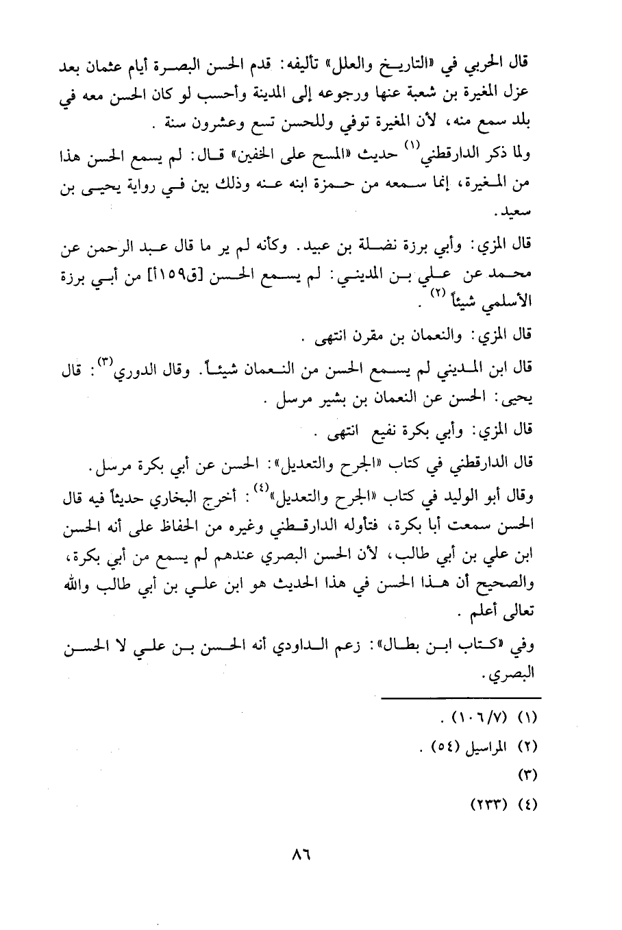ولما ذكر الدارقطني حديث «المسح على الخفين» قال: لم يسمع الحسن هذا من المغيرة، إنما سمعه من حمزة ابنه عنه، وذلك بين في رواية يحيى بن سعيد.