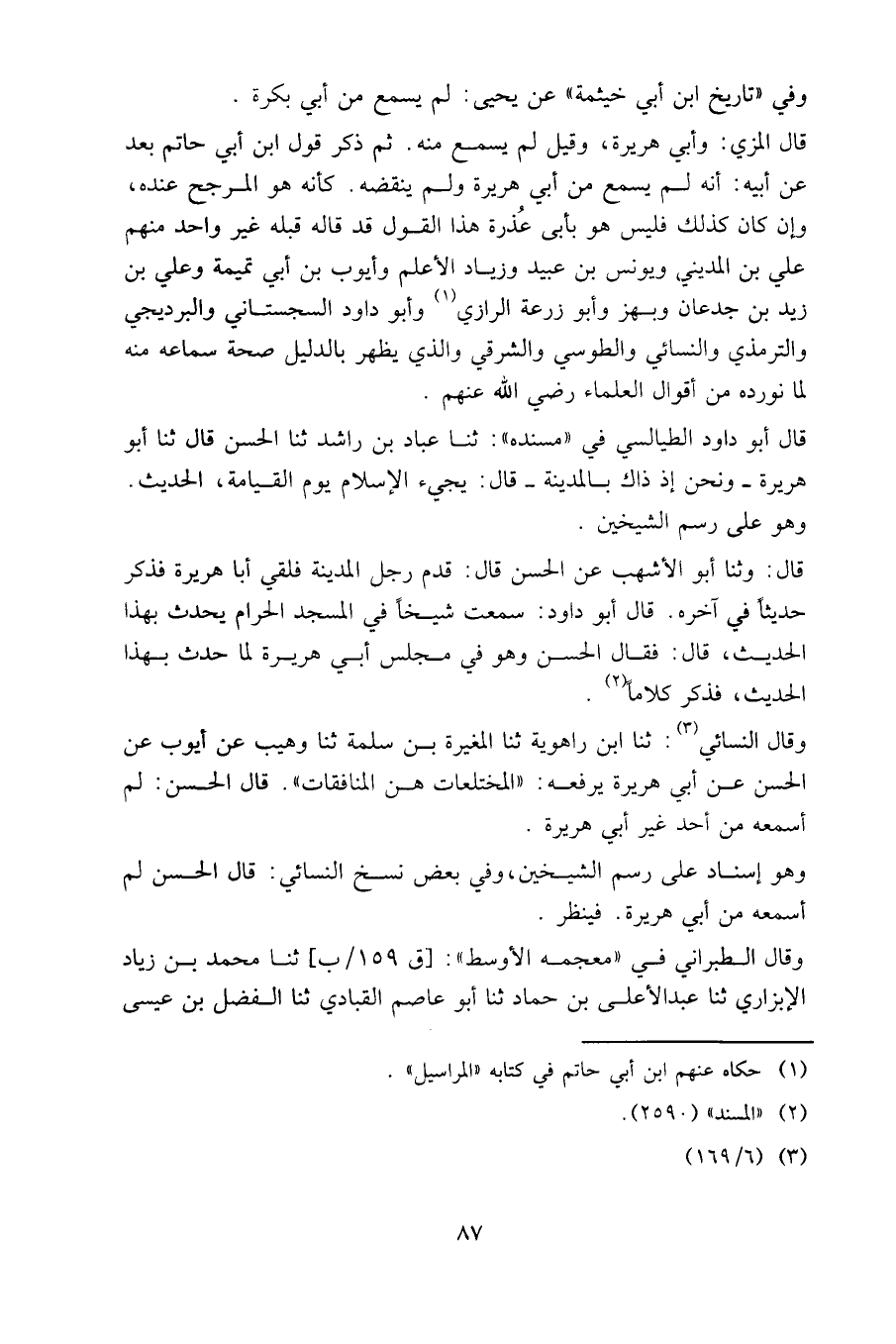 قال المزي: وأبي هريرة، وقيل لم يسمع منه. ثم ذكر قول ابن أبي حاتم بعد عن أبيه: أنه لم يسمع من أبي هريرة ولم ينقضه. كأنه هو المرجح عنده،