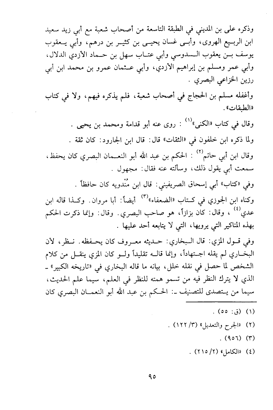 وفي قول المزي: قال البخاري: حديثه معروف كان يحفظه. نظر، لأن البخاري لم يقله اجتهادا، وإنما قاله تقليدا ولو كان المزي ينقل من كلام الشخص لما حصل في نقله خلل، بيانه ما قاله البخاري في «تاريخه الكبير» - الذي لا يترك النظر فيه من تسمو همته للنظر في العلم، سيما علم الحديث، سيما من يتصدى للتصنيف -: الحكم بن عبد الله أبو النعمان البصري كان