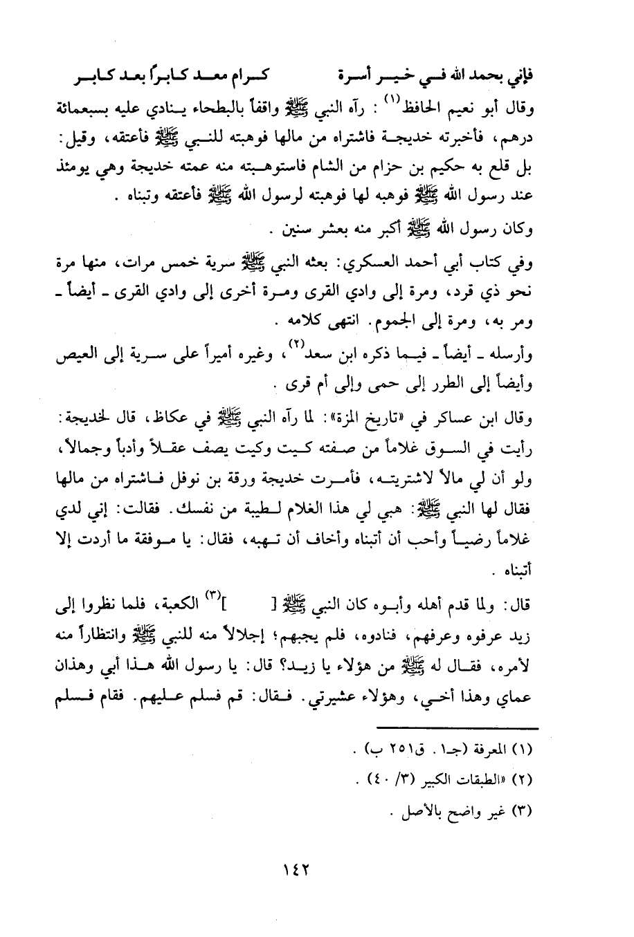 وقال أبو نعيم الحافظ: رآه النبي صلى الله عليه وسلم واقفا بالبطحاء ينادى عليه بسبعمائة درهم، فأخبرته خديجة فاشتراه من مالها فوهبته للنبي صلى الله عليه وسلم فأعتقه، وقيل: بل قلع به حكيم بن حزام من الشام فاستوهبته منه عمته خديجة وهي يومئذ عند رسول الله صلى الله عليه وسلم فوهبه لها فوهبته لرسول الله صلى الله عليه وسلم فأعتقه وتبناه.