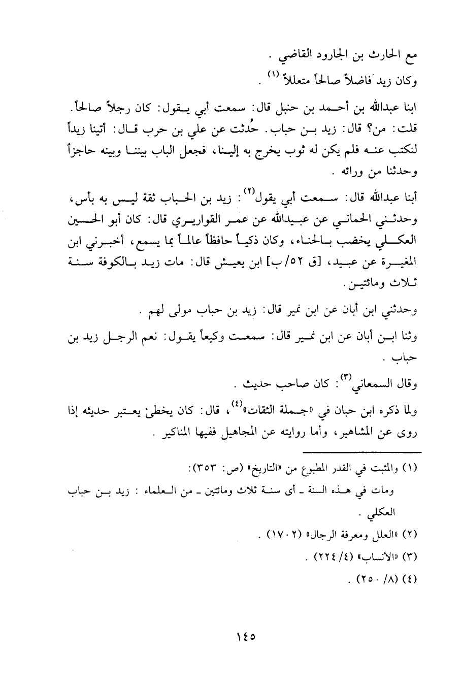 أبنا عبد الله قال: سمعت أبي يقول: زيد بن الحباب ثقة ليس به بأس، وحدثني الحماني عن عبيد الله عن عمر القواريري قال: كان أبو الحسين العكلي يخضب بالحناء، وكان ذكيا حافظا عالما بما يسمع، أخبرني ابن المغيرة عن عبيد، [ق 52 / ب] ابن يعيش قال: مات زيد بالكوفة سنة ثلاث ومائتين.