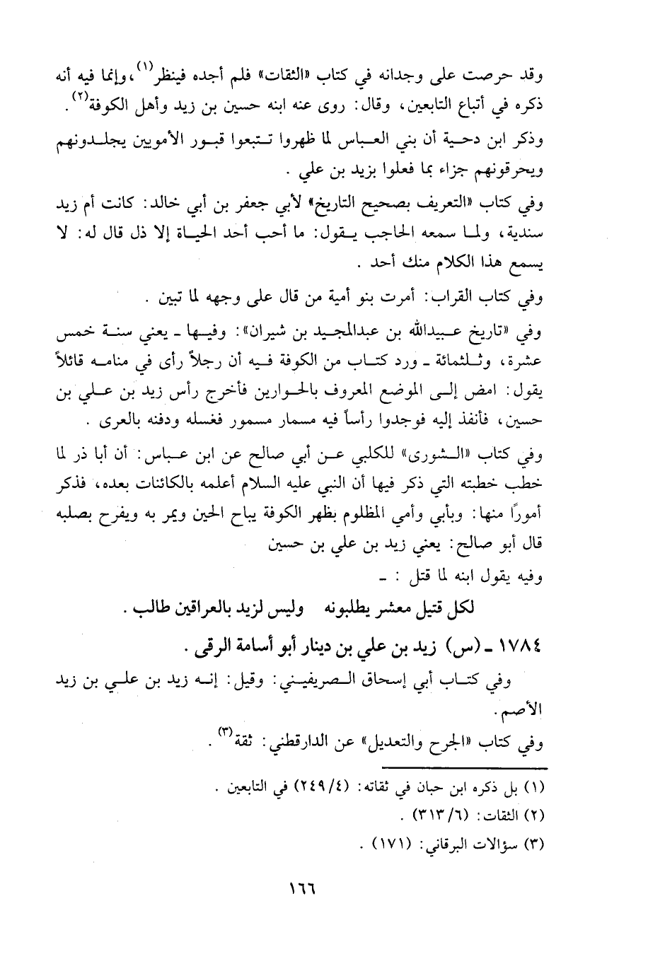 وقد حرصت على وجدانه في كتاب «الثقات» فلم أجده فينظر، وإنما فيه أنه ذكره في أتباع التابعين، وقال: روى عنه ابنه حسين بن زيد وأهل الكوفة.
