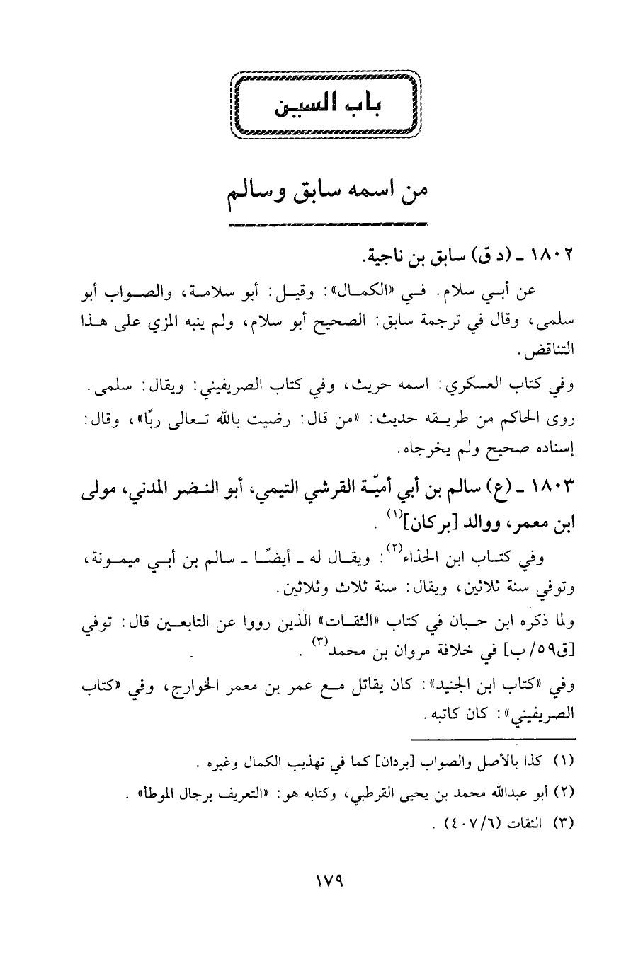 1803 - (ع) سالم بن أبي أمية القرشي التيمي، أبو النضر المدني، مولى ابن معمر، ووالد (بركان).