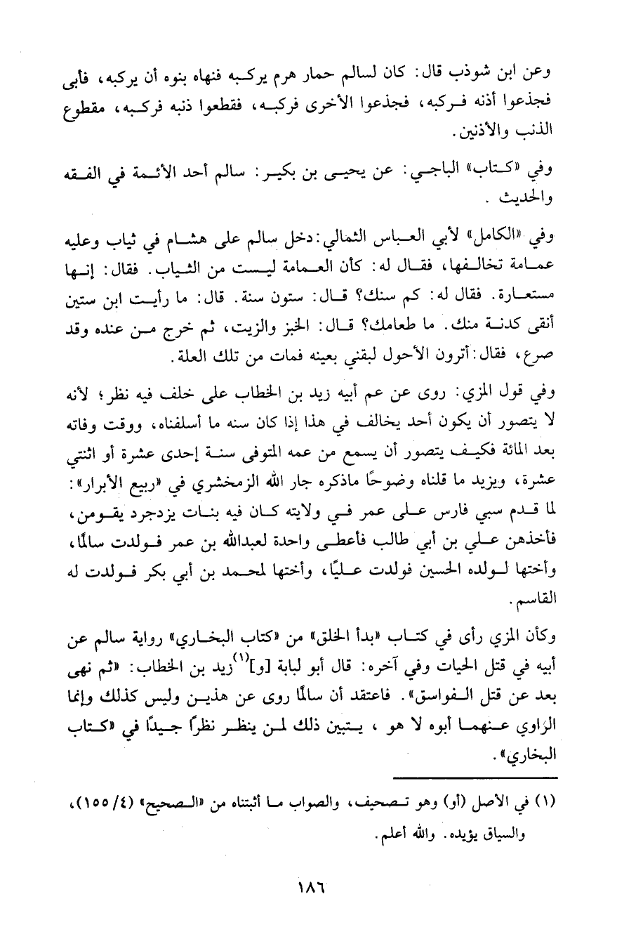 وكأن المزي رأى في كتاب «بدء الخلق» من «كتاب البخاري» رواية سالم عن أبيه في قتل الحيات وفي آخره: قال أبو لبابة (و) زيد بن الخطاب: «ثم نهى بعد عن قتل الفواسق». فاعتقد أن سالما روى عن هذين وليس كذلك وإنما الراوي عنهما أبوه لا هو، يتبين ذلك لمن ينظر نظرا جيدا في «كتاب البخاري».