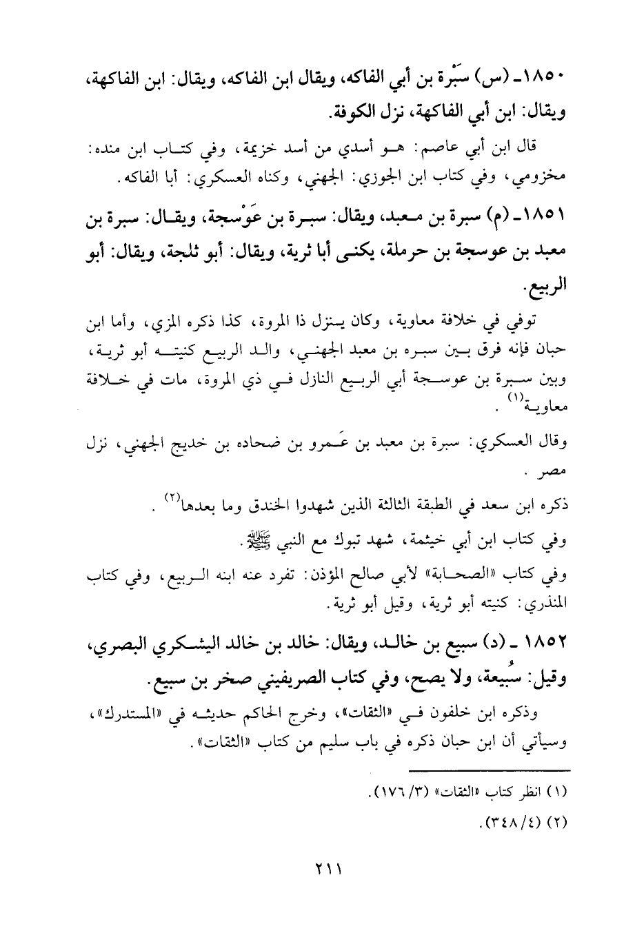 1850 - (س) سبرة بن أبي الفاكه، ويقال ابن الفاكه، ويقال: ابن الفاكهة، ويقال: ابن أبي الفاكهة، نزل الكوفة.