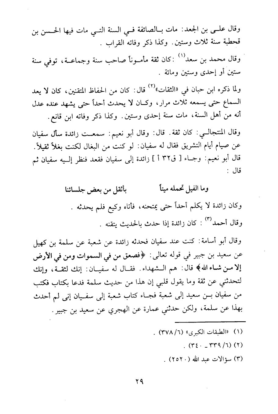 وقال أبو أسامة: كنت عند سفيان فحدثه زائدة عن شعبة عن سلمة بن كهيل عن سعيد بن جبير في قوله تعالى: (فصعق من في السماوات ومن في الأرض إلا من شاء الله) قال: هم الشهداء. فقال له سفيان: إنك لثقة، وإنك لتحدثني عن ثقة وما يقول قلبي إن هذا من حديث سلمة فدعا بكتاب فكتب من سفيان بن سعيد إلى شعبة فجاء كتاب شعبة إلى سفيان إني لم أحدث بهذا عن سلمة، ولكن حدثني عمارة عن الهجري عن سعيد بن جبير.