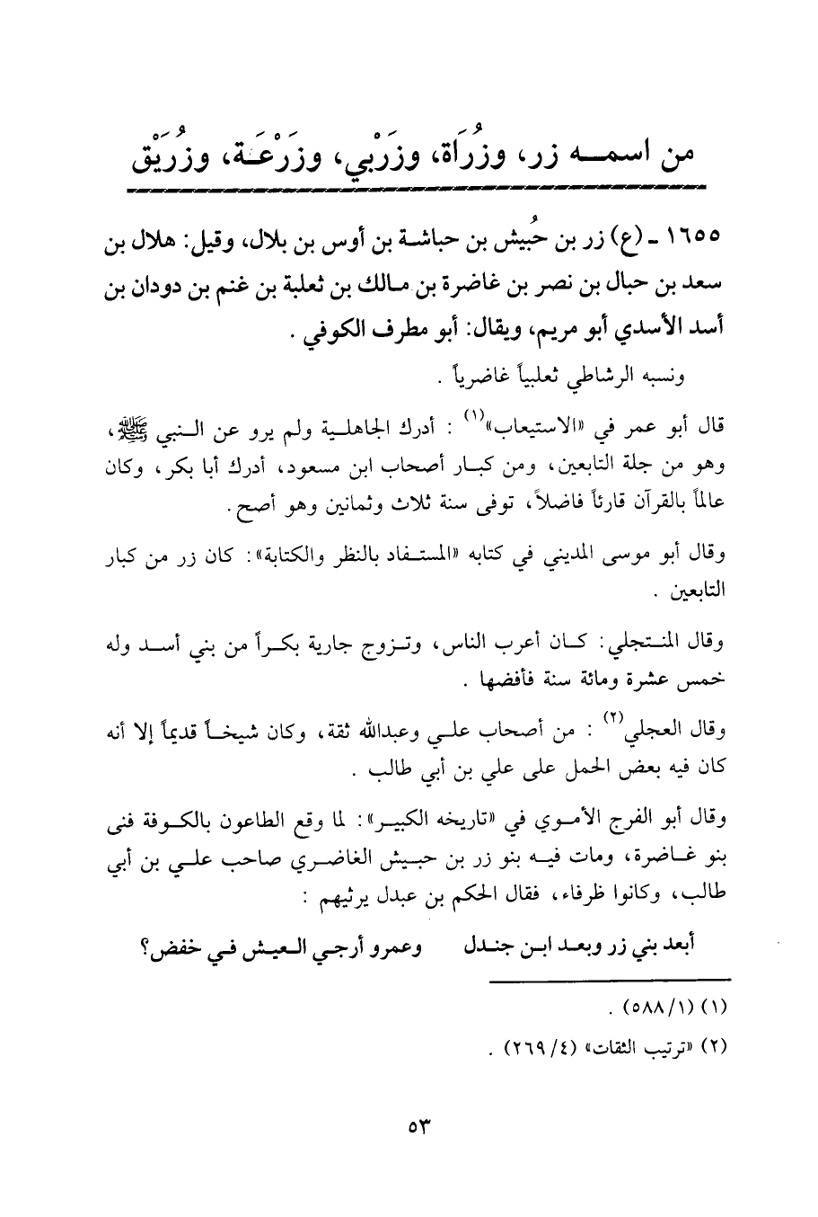 1655 - (ع) زر بن حبيش بن حباشة بن أوس بن بلال، وقيل: هلال بن سعد بن حبال بن نصر بن غاضرة بن مالك بن ثعلبة بن غنم بن دودان بن أسد الأسدي أبو مريم، ويقال: أبو مطرف الكوفي.