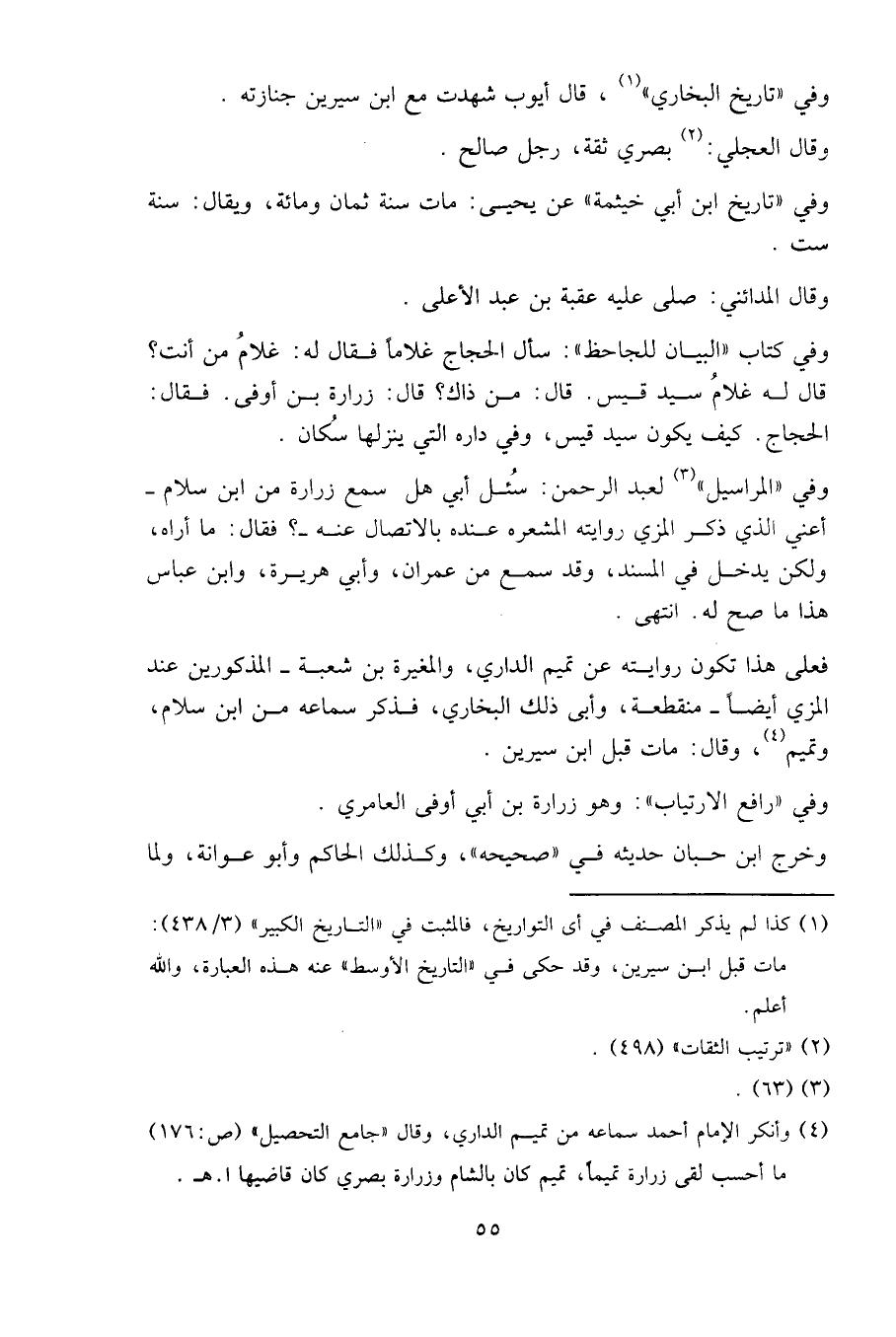 وفي «المراسيل» لعبد الرحمن: سئل أبي هل سمع زرارة من ابن سلام- أعني الذي ذكر المزي روايته المشعرة عنده بالاتصال عنه-؟ فقال: ما أراه، ولكن يدخل في المسند، وقد سمع من عمران، وأبي هريرة، وابن عباس هذا ما صح له. انتهى.