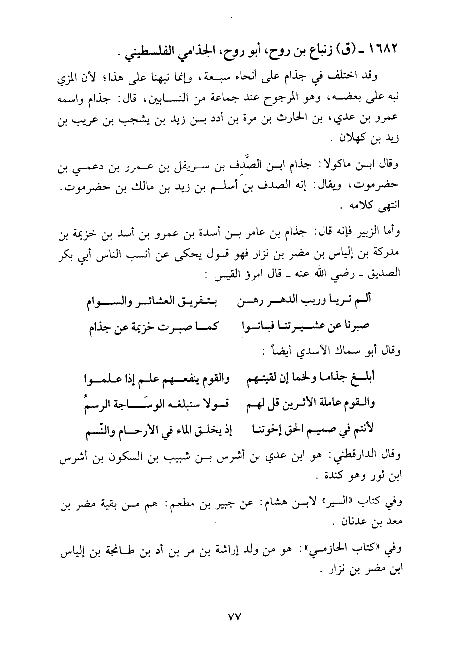 وأما الزبير فإنه قال: جذام بن عامر بن أسدة بن عمرو بن أسد بن خزيمة بن مدركة بن إلياس بن مضر بن نزار فهو قول يحكى عن أنسب الناس أبي بكر الصديق- رضي الله عنه- قال امرؤ القيس: